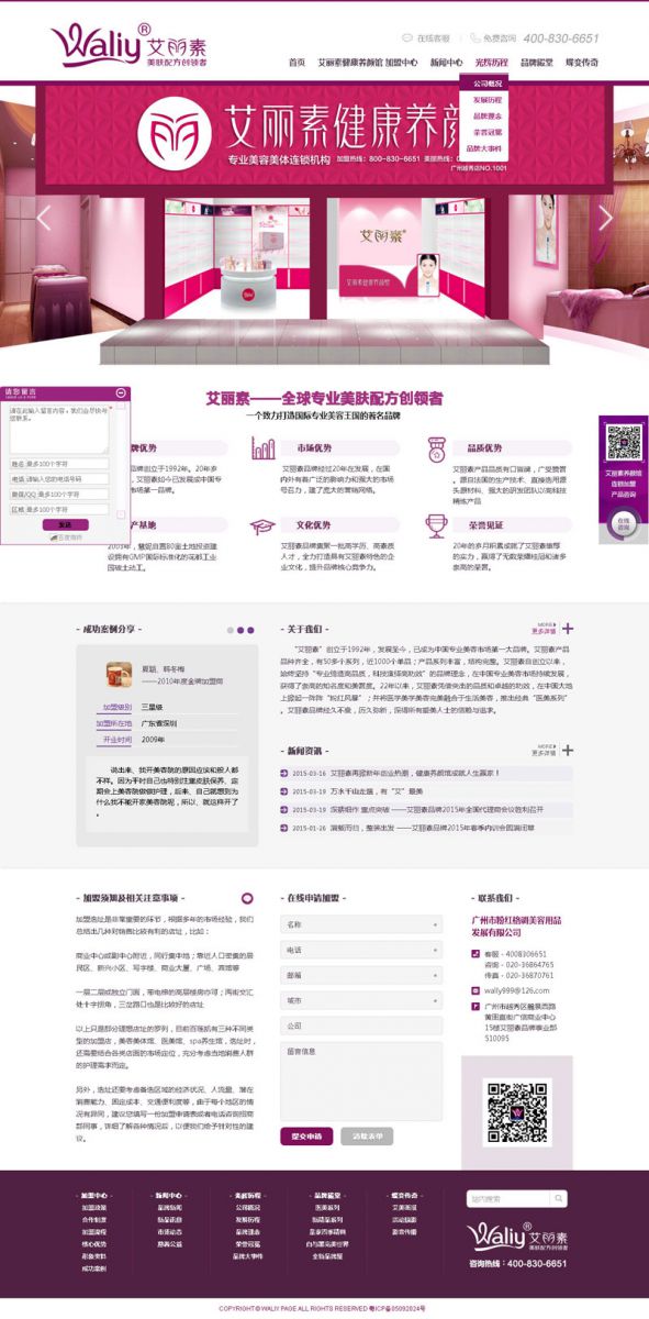 艾丽素【Waliy】是广州市艾丽素美容品实业发展有限公司推广的品牌,随着业务升级,艾丽素网站升级改版,以更大气的形象、更丰富的栏目展现给客户。项目地址:www.waliy.com