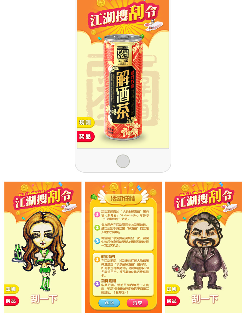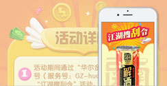 江湖搜刮令微信游戏是广州华尔金生物有限公司在其产品“华尔金解酒茶”的新闻发布会上现场举行的微信公众号游戏,轻刮解酒茶底图,出现的各类精致的江湖人物代表不同的奖励。游戏简单,界面精致,奖励丰富,深受现场玩家的喜爱。